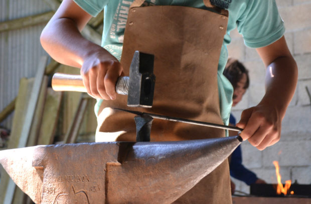 Dans une forge traditionnelle et accompagné par un forgeron professionnel, les jeunes apprennent les techniques de base et les gestes pour réaliser des créations en fer qui seront intégrées au bâti.