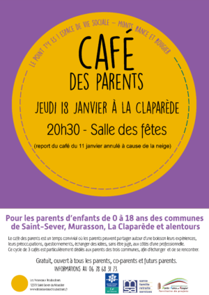 Parce qu’être parent ce n’est pas tous les jours facile et qu’échanger entre parents peut nous aider, un dernier café des parents est proposé jeudi 18 janvier à 20h30 à la salle des fêtes de Laclaparède (il était prévu le 11 janvier mais annulé à cause de la neige).
