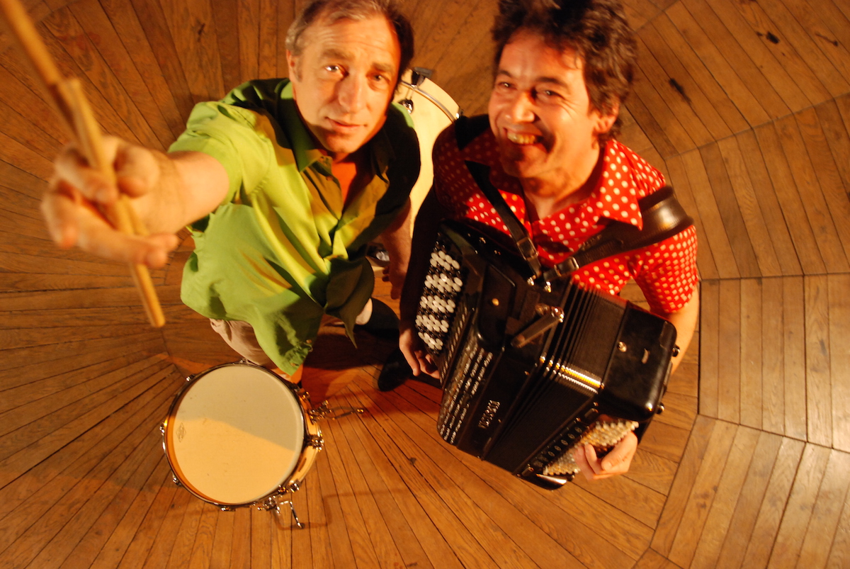 Ce duo est le fruit de la rencontre de deux musiciens fascinants : Didier Dulieux à l’accordéon, qui réfléchit au rapport corps-accordéon ; et Eric Boccalini à la batterie et aux percussions, qui a lui la percussion chevillée au corps.