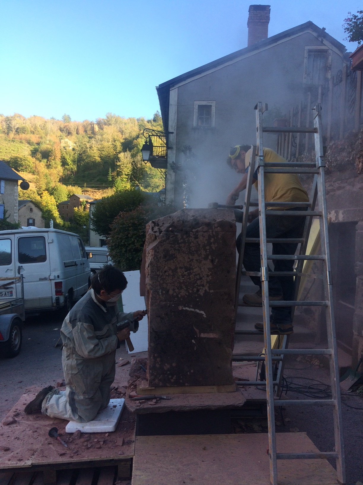 Anaïs Eychenne sculpte un bloc de grès rouge sur la place depuis le 5 octobre. Rencontre le 3 novembre avant la fête des châtaignes.