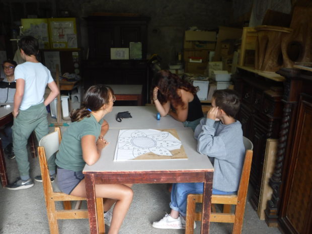 Le troisième jour a été consacré à la construction insolite. Les jeunes ont commencé leur morceau d’œuvre collective. Ils ont choisi les couleurs de leur mosaïque et commencé à la réaliser. Les jeunes en maçonnerie ont réalisé des blocs de ciment qu’ils ont pu sculpter. Ces blocs seront inclus dans la construction insolite prochainement. Le soir, certains jeunes ont profité d’un concert de musique dans le bar du village, tandis que d’autres ont réalisé une soirée jeu tranquille sur le camp.